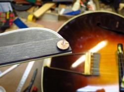 ピックガードを仮置きしてブラケットの接着面の隙間を確認します。隙間ががあるようなら板を貼って接着面をフィットさせます