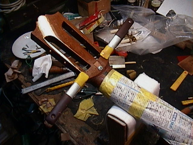 付き板の接着後ヘッド形状に合わせて整形し、小さな欠けや凹み箇所にはパテを埋めて着色タッチアップしオリジナルの雰囲気に近づけます