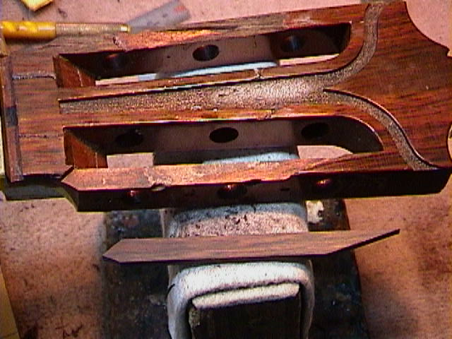 付き板の欠損部分は同じようなハカランダ材でパーツを作り接着します