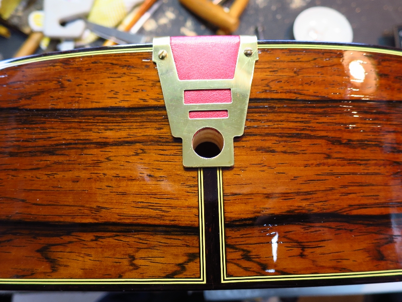 Stringphonic Original Selmer Replica / Advanced Model (な、ながっ!笑)にK&K Twin Spot Internal ピックアップを取り付けます。まずテイルピースにエンドピンジャック用の穴を開けます