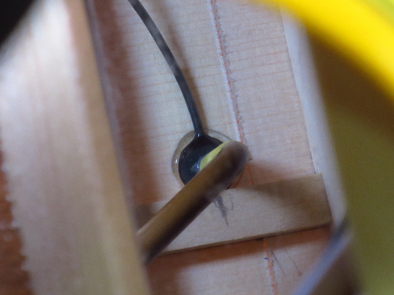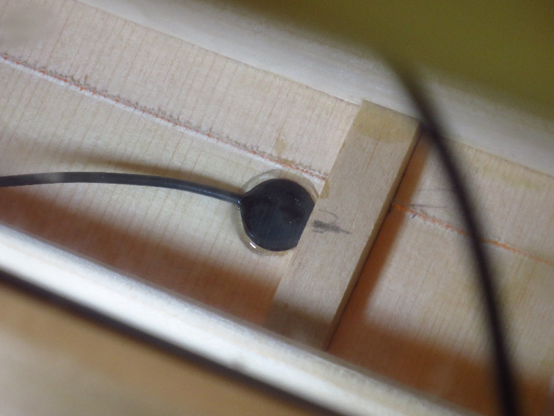ピックアップケーブルがボディ内でぶらぶらしないように裏板のブレーシングにケーブルクリップを設置し固定します