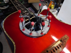 次に塗装クラックを修理します。前もって外しておいたプリアンプの空きスペースを利用してロングクランプを挿し入れクラック箇所を圧着修理します