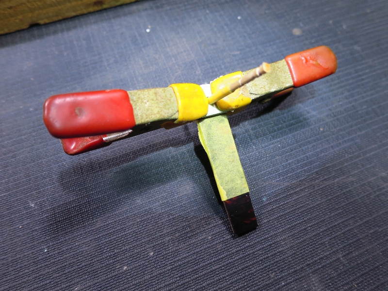 ピン穴を下げたことに合わせてブラケットの留め板も短くする必要があり、同じような素材を集めて作り直します。素材4枚をアロンジェルで接着します