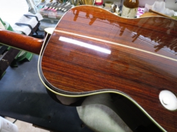Martin 000-42 ですが、バック左側ウエスト部のバインディングが5cmぐらいはがれています。シュリンク(収縮)がきつくバインデイングにかなりのストレスが掛かっています