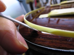 ウエスト部のパーフリングが一部はがれていましたので、しっかり接着するため、当て木を使ってハタガネクランプします