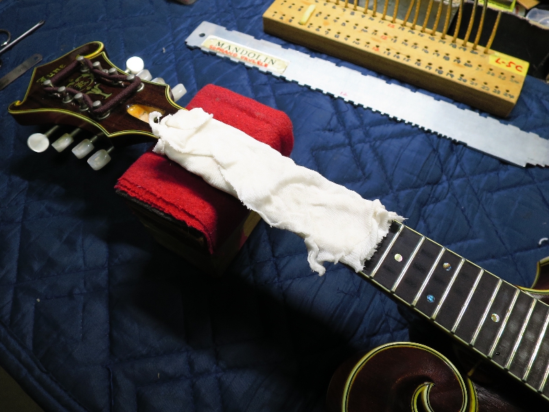 いつもお世話になっているギター整作家の西貝清氏製作のJune Apple Mandolinです。丁寧な作りでよく鳴っていますが、フレットがかなり減ってきましたので打ち換えることになりました。ついでに現在の牛骨ナットをマザー・オブ・パール(MOP) に交換し、ブリッジ周りも調整してベストな状態にします